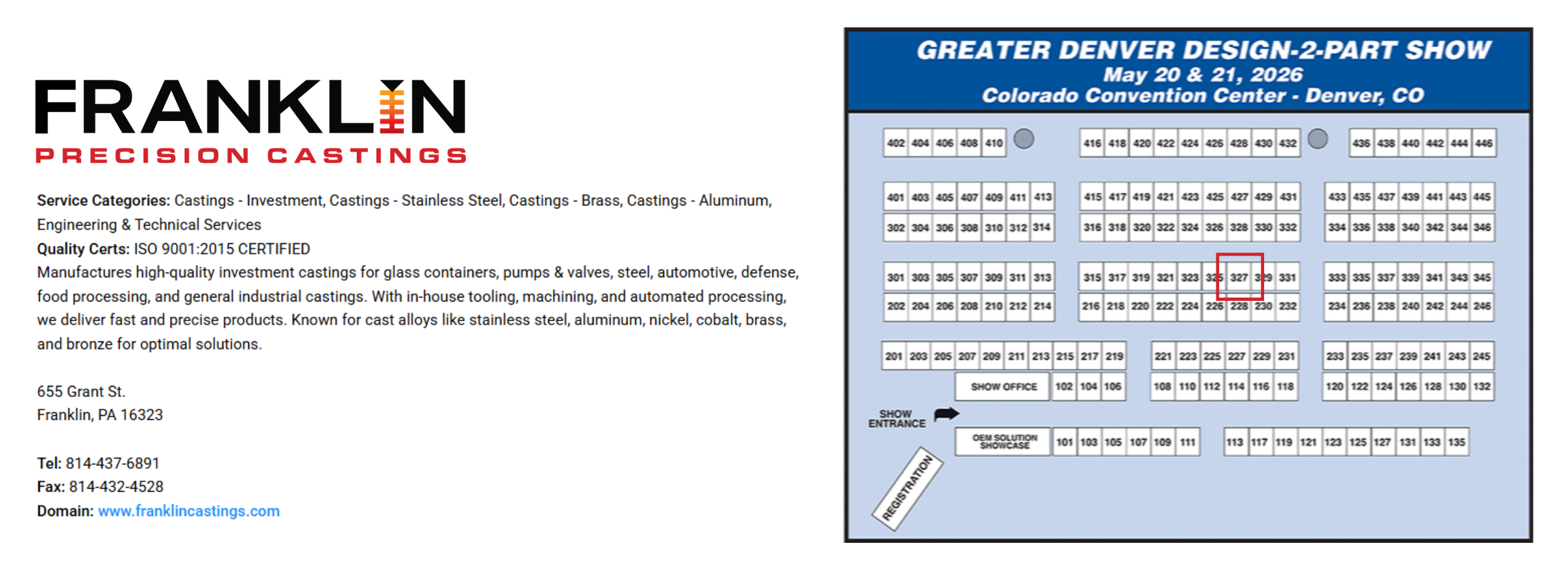 Franklin Precision Castings will be exhibiting at Design-2-Part in Denver, CO on May 20th and 21st, 2026. Visit Booth #327 to learn more about our investment castings .